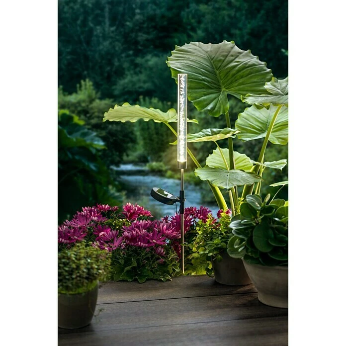 Die BAUHAUS Solarleuchte, wird durch umweltfreundliche Solarenergie betrieben und ist mit einem energiesparenden LED-Leuchtmittel ausgestattet. Die Luftblasen im Leuchtenschirm sorgen für eine stimmungsvolle Atmosphäre und werden zum echten Hingucker in Ihrem Außenbereich. Je nach Standort und Wetterverhältnissen beträgt die Leuchtdauer der Solarleuchte bis zu acht Stunden. Durch die Schutzart IP 44 ist die Leuchte vor äußeren Einflüssen geschützt.