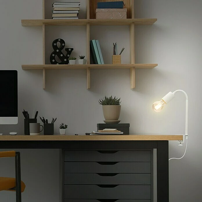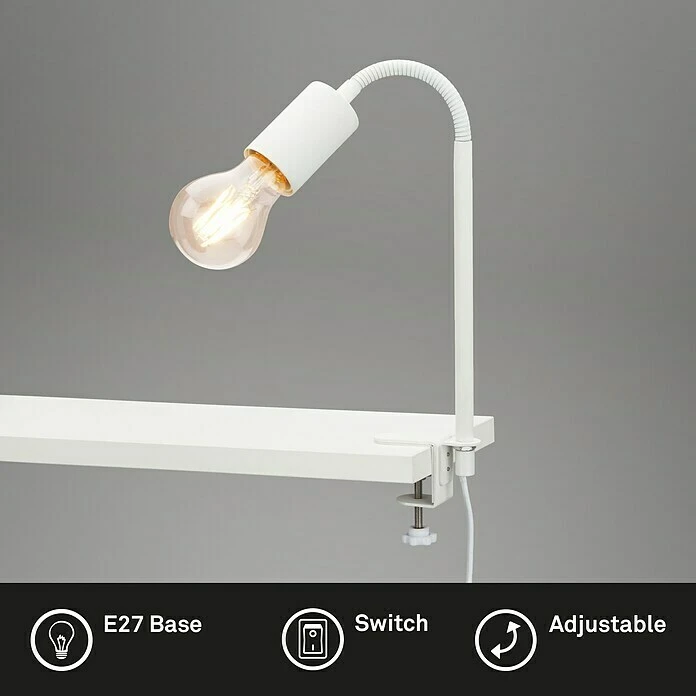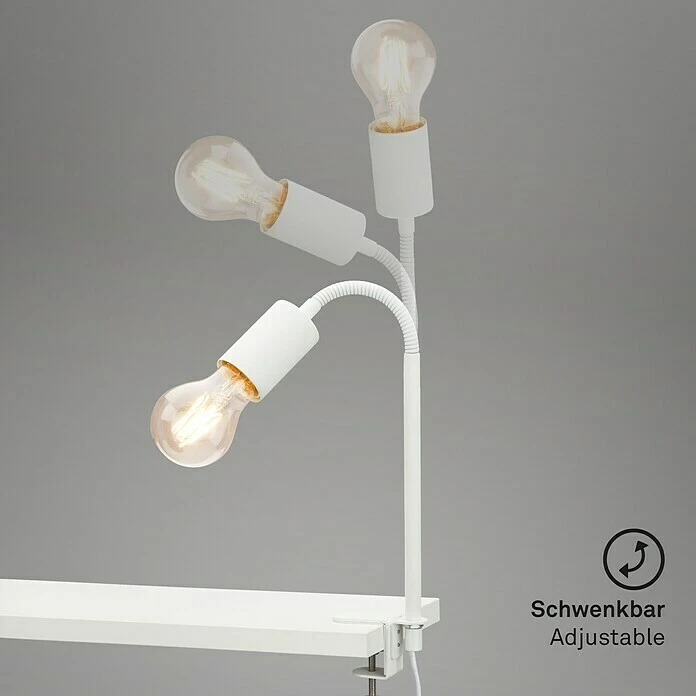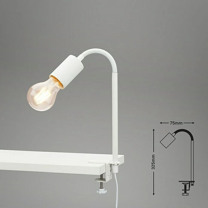 Die 1-flammige weiße KRAMPO RETRO Klemmleuchte eignet sich hervorragend als Leselicht. Ob am Bett oder an einem Bücherregal, durch ihre Schraubklemme kann sie flexibel montiert werden. Über einen inkludierten Flexarm, ist Lichtposition ist individuell einstellbar. Die Leuchte wird exkl. 1 x E27 max. 10W geliefert. Die Gesamtlänge gestreckt sich ohne Leuchtmittel auf 477mm X 325mm (H), Ø42mm (Kopf), Ausladung: 165mm.
