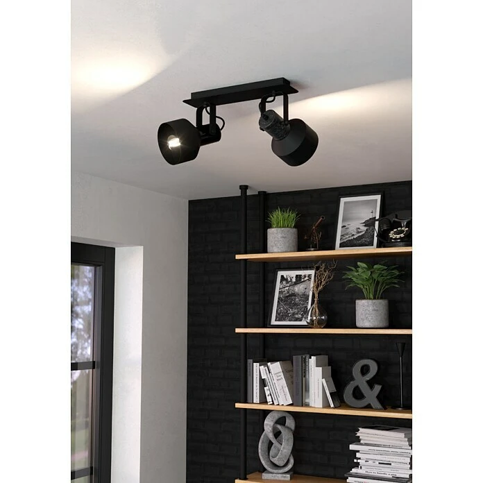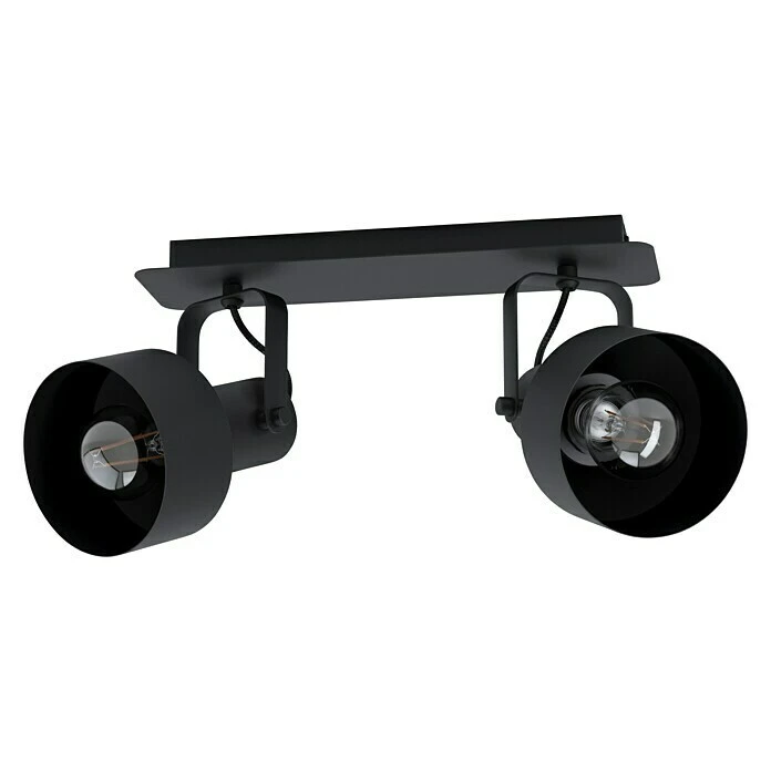 Die Deckenleuchte CASIBARE ist aus schwarzem Metall mit zwei beweglichen schwarzen Spots gefertigt. Die Deckenlampe im monochromen Design fügt sich nahtlos in moderne Einrichtungen ein und bietet durch die dreh- sowie schwenkbaren Leuchtenköpfe die Möglichkeit einzelne Lichtakzente im Raum zu setzen – egal ob im Wohnzimmer, Schlafzimmer, Flur oder Esszimmer. Die abgebildeten Filament-Leuchtmittel sind nicht im Lieferumfang enthalten. Geeignet ist die Leuchte für jedes Leuchtmittel mit E27-Sockel.