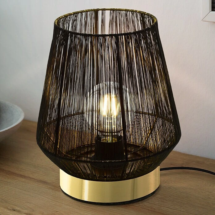 Die Tischleuchte ESCANDIDOS besteht aus einem mit hauchdünnem Draht umwickelten Lampenschirm, der in Handarbeit gefertigt wird. Der Lampenfuß in Messing-Gebürstet rundet den einzigartigen Look der Leuchte gekonnt ab. Die filigranen Drahtfäden sorgen im eingeschalteten Zustand für faszinierende Licht- und Schattenspiele und kommen dank ihrer messingfarbenen Innenseite besonders gut zur Geltung. Ein bequemes Ein- und Ausschalten ist über einen Schalter am Kabel möglich. Die Tischlampe fügt sich mit ihrem besonderen Design nahezu in jeden Wohnstil ein und bietet eine stilvolle Beleuchtung im Schlafzimmer, Wohnzimmer, Flur oder Esszimmer. Das abgebildete Filament-Leuchtmittel ist nicht im Lieferumfang enthalten. Geeignet ist die Leuchte für jedes Leuchtmittel mit E27-Sockel.