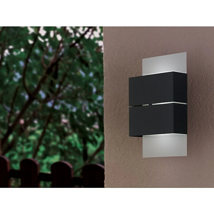 Die LED Außenwandleuchte KIBEA von Eglo besteht aus einem anthrazitfarbenen Metall-Körper mit einem schmalen Cut-Out, an dem jeweils oben sowie unten eine weiße Aluguss-Scheibe befestigt wurde. Die integrierten LEDs im Leuchtenkörper strahlen angenehmes, warmweißes Licht indirekt gegen die weißen Aluguss-Elemente sowie durch das Cut-Out des Metall-Körpers. Dank des modernen Designs fügt sich die Wandlampe in nahezu jeden Outdoor-Bereich ein und bietet eine indirekte sowie stilvolle Beleuchtung an der Hauswand. Die Außenlampe ist spritzwassergeschützt (IP44) und ermöglicht einen bedenkenlosen Einsatz im Außenbereich.
