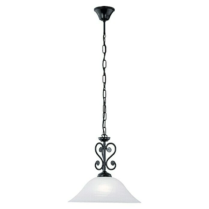 Die 1-flammige Pendelleuchte Murcia von Eglo besticht mit ihrer wunderschönen Optik. Die Leuchte im Landhausstil beeindruckt mit der Kombination aus schwarzem, verschnörkeltem Stahl und weißem Alabasterglas. Die Form des Schirms rundet die rustikale Optik ab und macht die Leuchte zu einem echten Hingucker in Ihrem Wohnbereich.