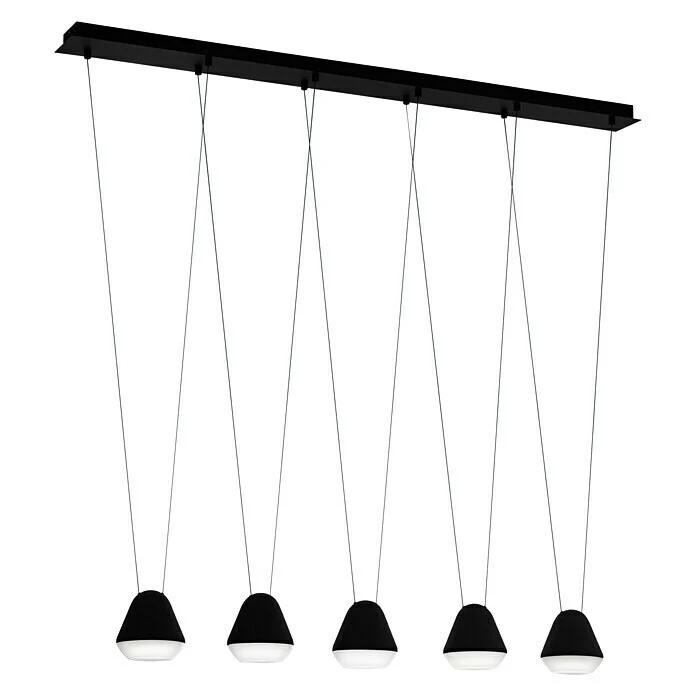 Die LED Pendelleuchte PALBIETA ist mit fünf konischen Leuchtenköpfen aus schwarzem Metall gefertigt, die durch je zwei Metallseile an einem schwarzen Metall-Baldachin abgehängt wurden. Die mitgelieferten LED GU10-Leuchtmittel unter der satinierten Kunststoff-Abdeckung strahlen angenehmes warmweißes Licht auf den darunterliegenden Bereich. Dank des puristischen Designs der Hängelampe rundet sie insbesondere moderne Einrichtungen im minimalistischen Stil ab. Sie bietet eine stilvolle Beleuchtung im Wohnzimmer oder im Esszimmer beispielsweise über einem länglichen Esstisch.