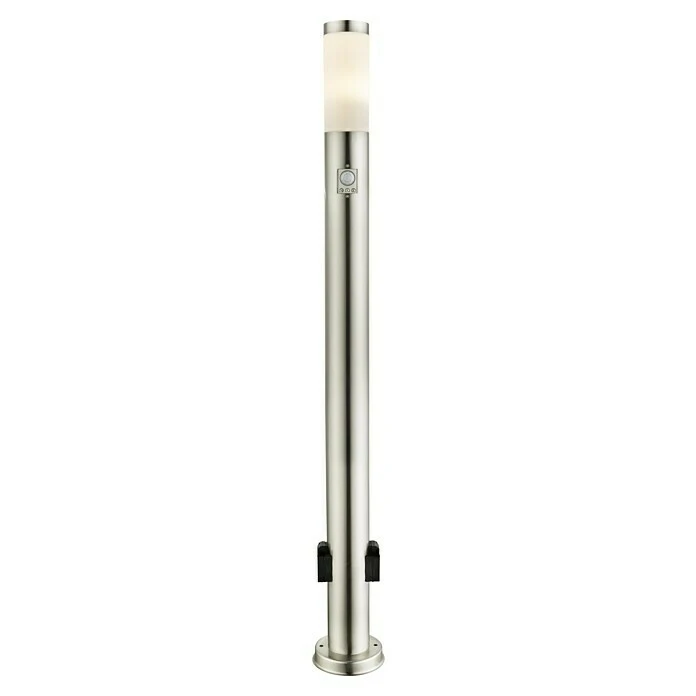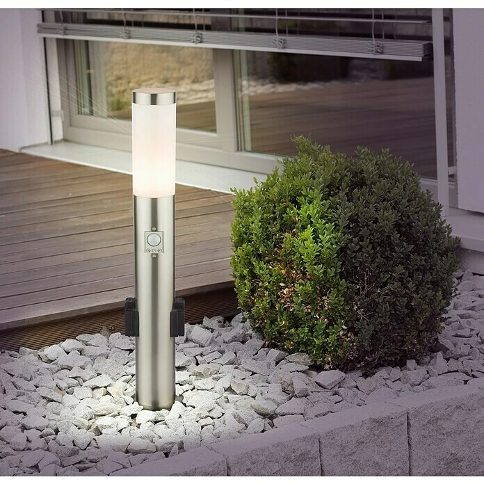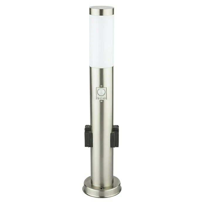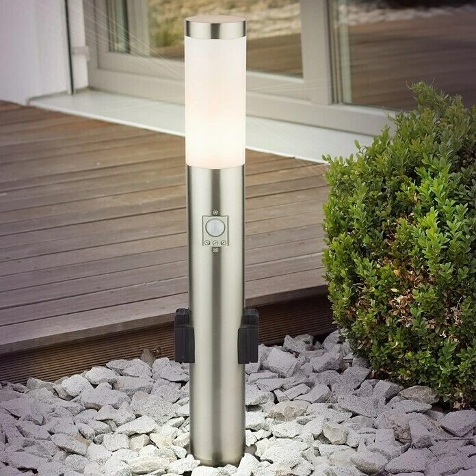Diese elegante Außensockelleuchte Boston von Globo zeichnet sich durch ihr stilvolles Design und die tolle Verarbeitung aus. Die formschöne Außenlampe ist aufgrund ihrer Schutzart IP44 bestens für den Außenbereich geeignet. Die Leuchte ist aus Edelstahl und opalen Kunststoff gefertigt und hat eine Gesamthöhe von 60 cm. Die Lampe ist mit einer E27 Fassung sowie dem passenden LED Leuchtmittel ausgestattet. Dieses leistet ein 500 Lumen starkes Licht mit einer angenehmen 3000K warmweißen Lichtfarbe. Ein zusätzlicher Pluspunkt ist der integrierte Bewegungsmelder (90°) mit einer Reichweite von bis zu 8 Metern und die zwei integrierten Steckdosen.