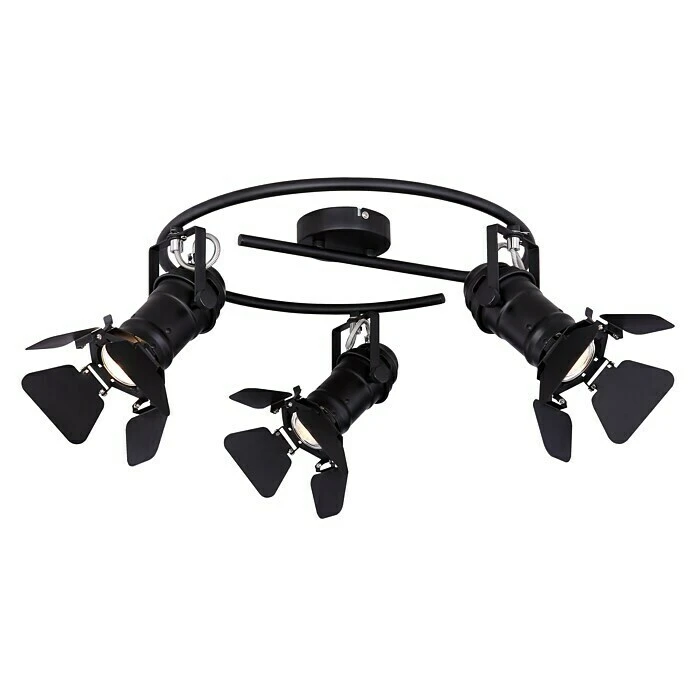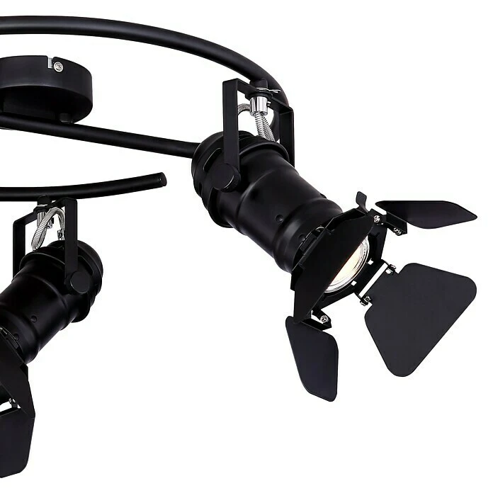 Mit dem Strahler Egon von Globo werden besondere Akzente in jedem Wohnbereich gesetzt. Der Dreifachstrahler mit einem Durchmesser von 40cm ist im Stil eines Filmset-Strahlers designt und besteht aus schwarzem Metall. Die drei beweglichen Spots, an einem formschönen spiralförmigen Arm befestigt, wirken mit den am Strahler angebrachten beweglichen Klappen authentisch. Jeder Strahler verfügt über eine GU10 Fassung und kann mit einem Leuchtmittel von maximal 50 Watt ausgestattet werden.