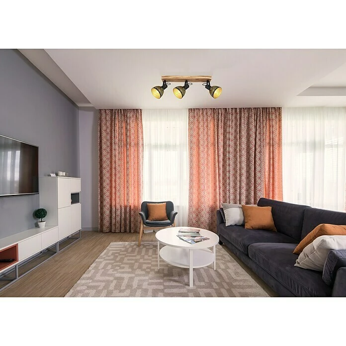 Dieser Strahler aus der Lenna-Serie (54×12,5 cm) fügt sich wunderbar ins Ambiente verschiedenster Wohnstile. Er besteht aus einem dunkelbraunen Holzbalken, der mit drei schwenkbaren, schwarzen Metallschirmen mit linienförmigen Stanzungen versehen ist. Diese sind an der Innenseite golden getönt und können mit E27-Leuchtmitteln Ihrer Wahl bestückt werden, wodurch Sie die Möglichkeit haben, Lichtfarbe und Helligkeit individuell zu bestimmen. Durch weitere Modelle der gleichen Serie können Sie das Gesamtbild in Ihren vier Wänden komplettieren.