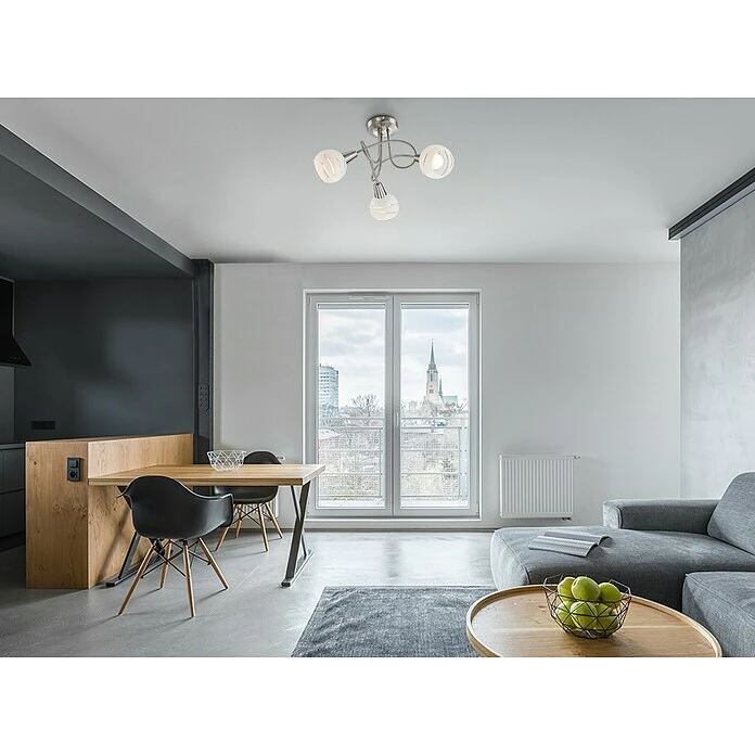 Die 3-flammige Globo Elliott LED-Deckenleuchte zeichnet sich durch ein modernes sowie elegantes Design aus. Hierfür sorgt die Kombination aus mattem Nickel im Korpus und satiniertem weiß mit klaren Linien im Schirm. Dadurch entstehen bei der Beleuchtung besonders schöne Lichtakzente. Diese Leuchte passt sehr gut in Wohnräume, in denen eine angenehme, blendfreie und warmweiße Beleuchtung erwünscht ist. Mit ihrem Design ist sie nicht auf bestimmte Einrichtungsstile festgelegt, sondern harmoniert mit vielen verschiedenen Einrichtungen. Das enthaltene LED-Leuchtmittel ist sehr energiesparend, langlebig und kann bei Bedarf gewechselt werden. Ein besonderer Blickfang entsteht durch die ineinander geschwungenen Arme.