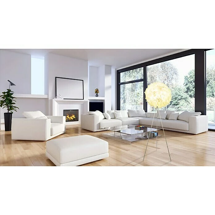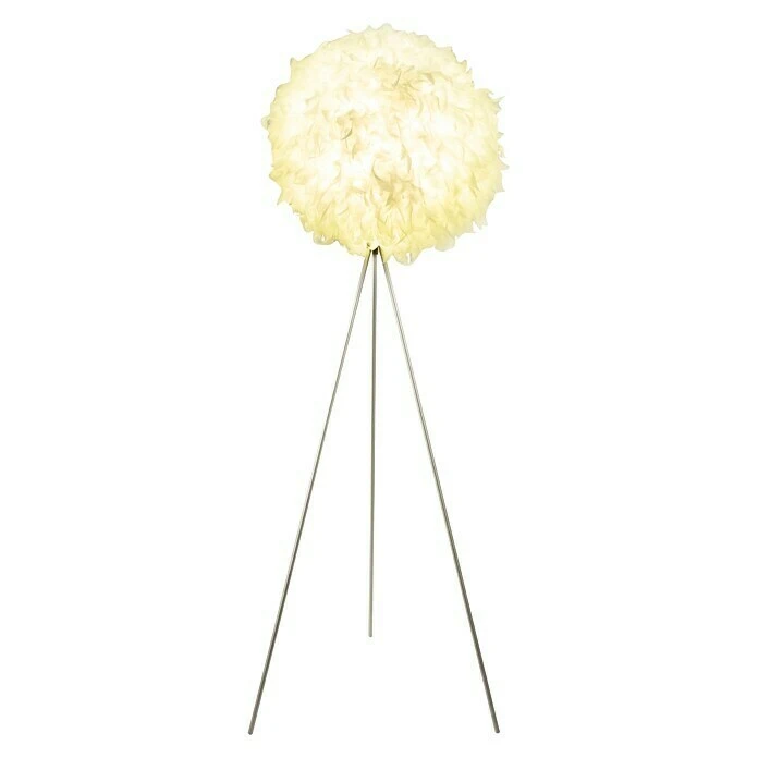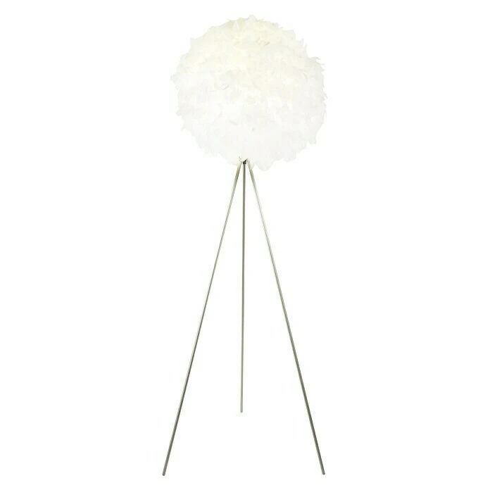 Die Globo Katunga Stehleuchte besticht mit ihrer ausgefallenen Optik und wird in jedem Raum zum Blickfang. Die echten weißen Federn, die auf dem Lampenschirm angebracht sind, verleihen der Produktserie etwas Außergewöhnliches. Sie eignet sich perfekt für das Wohnzimmer oder Schlafzimmer und schafft eine entspannte Atmosphäre. Sie ist mit einer E27-Fassung ausgestattet und kann mit Leuchtmitteln bis 40 W der Energieeffizienzklassen von A++ bis E verwendet werden. Durch die freie Leuchtmittelwahl können die Helligkeit und die Lichtfarbe ganz den persönlichen Bedürfnissen angepasst werden. Um eine smarte Lichtsteuerung zu ermöglichen, bietet sich die Nutzung eines passenden smarten Leuchtmittels an.