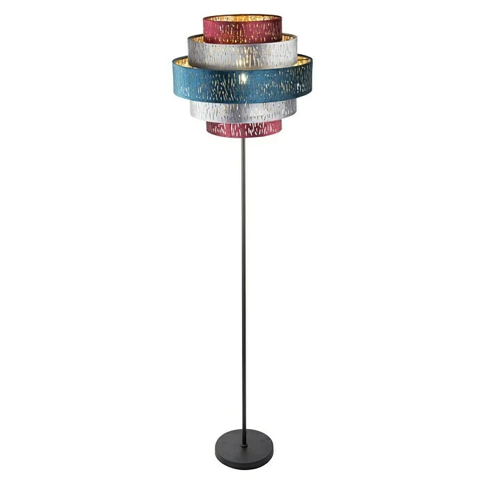 Die schwarz/bunte Stehleuchte Ticon von Globo wird in vielen Wohnräumen zum echten Blickfang. Die Schirme sind mit Samtstoff überzogen und haben eine goldfarbene Innenseite, die aufgrund der Dekorstanzungen für tolle Reflektionen und Lichteffekte sorgen. Hiermit wird die Pendelleuchte zum dekorativen Bestandteil des jeweiligen Raumes. Durch ihre Länge eignet sie sich sehr gut für die Nutzung über einem Esstisch. Mit ihrer E27-Fassungen ist die Leuchte für Leuchtmittel der Energieeffizienzklassen von A++ bis E mit maximal 60 Watt geeignet. Daher kann Lichtfarbe und Strahlkraft über die Wahl des passenden Leuchtmittels beeinflusst werden.