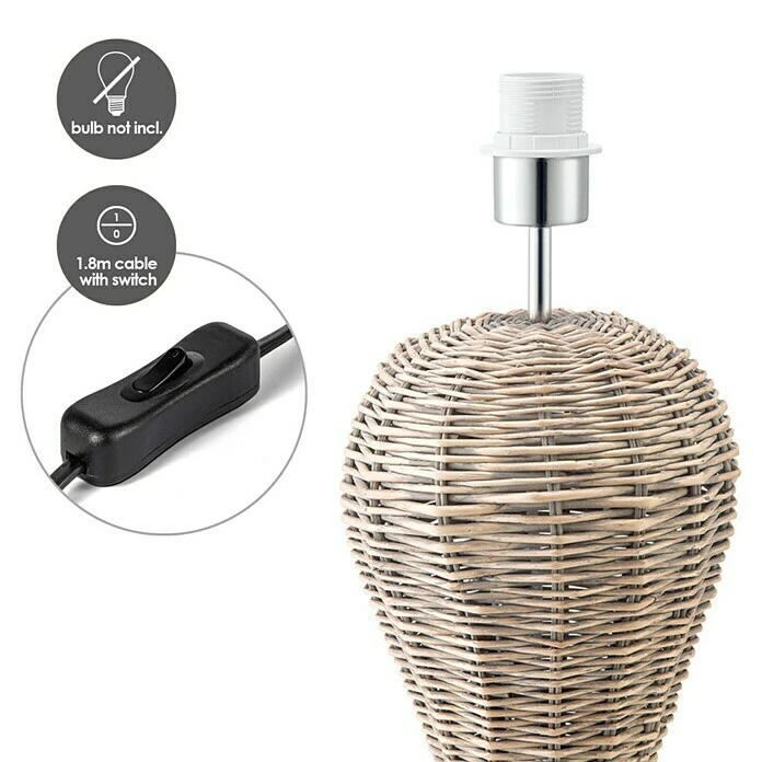 Der Home Sweet Home Lampenfuß Rattan wird durch seine Herstellung aus ineinander verflochtenem Rattan zum Hingucker. Der Lampenfuß kann mit passenden Lampenschirmen mit einem maximalen Durchmesser von 40 Zentimetern für ein individuelles Design kombiniert werden. Es ist für Leuchtmittel mit E27-Fassung und maximal 40 Watt der Energieeffizienzklassen von A++ bis E geeignet. Hierdurch kann Helligkeit und Strahlkraft nach individuellen Wünschen über die Auswahl des Leuchtmittels beeinflusst werden. Des Weiteren kann der Lampenfuß bequem durch einen Schalter an- und ausgeschaltet werden.