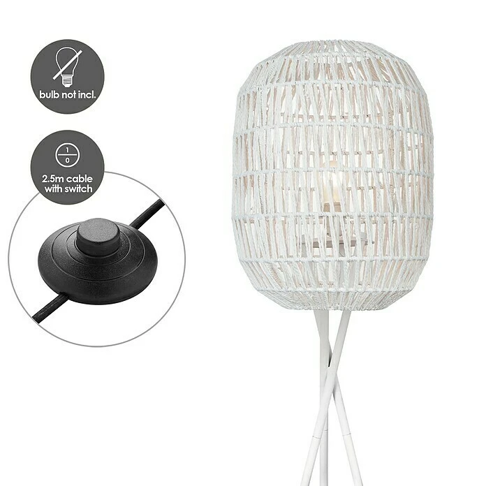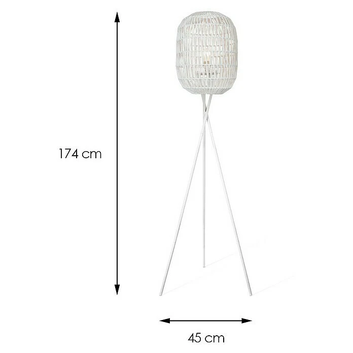 Die 1-flammige Home Sweet Home Rope Stehleuchte wird wegen ihrer besonderen Form zum optischen Blickfang. Der Lampenschirm besteht aus einem kunstvoll um ein Metallgestell geflochtenes Seil, welches freie Sicht auf das Leuchtmittel erlaubt. Hierdurch bietet sich die Tischleuchte ideal für die Kombination mit einem optischen Leuchtmittel an, um die Optik noch zu unterstützen. Mit ihren drei sich überkreuzenden Beinen und der Gesamthöhe von 1,5 Meter ist sie ein moderner Hingucker im Wohnbereich. Sie ist für Leuchtmittel mit E27-Fassung und maximal 60 Watt der Energieeffizienzklassen von A++ bis E geeignet. Hierdurch kann Helligkeit und Strahlkraft nach individuellen Wünschen über die Auswahl des Leuchtmittels beeinflusst werden. Die Stehleuchte ist des Weiteren bequem per Schalter bedienbar und durch das 2,50 Meter lange Kabel ist ein Verschieben in diesem Radius problemlos möglich.