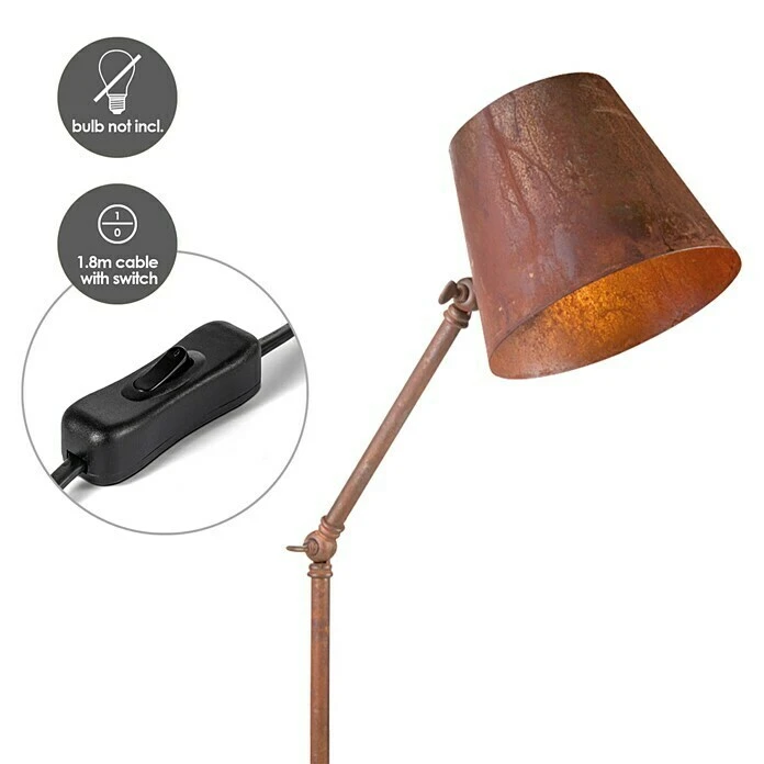 Die Home Sweet Home Sweep Tischleuchte fällt mit einer rostfarbenen Optik in Vintage-Design als Blickfang in vielen Wohnbereichen auf. Somit kann sie sowohl durch ihre Beleuchtung als auch Optik begeistern. Die Tischleuchte ist mit ihrer E27-Fassung für Leuchtmittel der Energieeffizienzklassen von A++ bis E mit maximal 10 Watt geeignet, wodurch ein Leuchtmittel je nach Wünschen an Helligkeit und Lichtfarbe ausgesucht werden kann. Es bietet sich auch die Nutzung eines Leuchtmittels an, das mit einer Farbsteuerung ausgestattet ist. Durch die beiden Gelenke lässt sie sich in der Höhe verstellen und schwenken. Über den verbauten Kabelschalter kann die Tischleuchte bequem ein- und ausgeschaltet werden. Die Tischleuchte kann mit weiteren Leuchten der Serie Sweep kombiniert werden, einen Wohnbereich mit optisch passenden Steh-, Tisch-, Wand- und Pendelleuchten zu beleuchten.