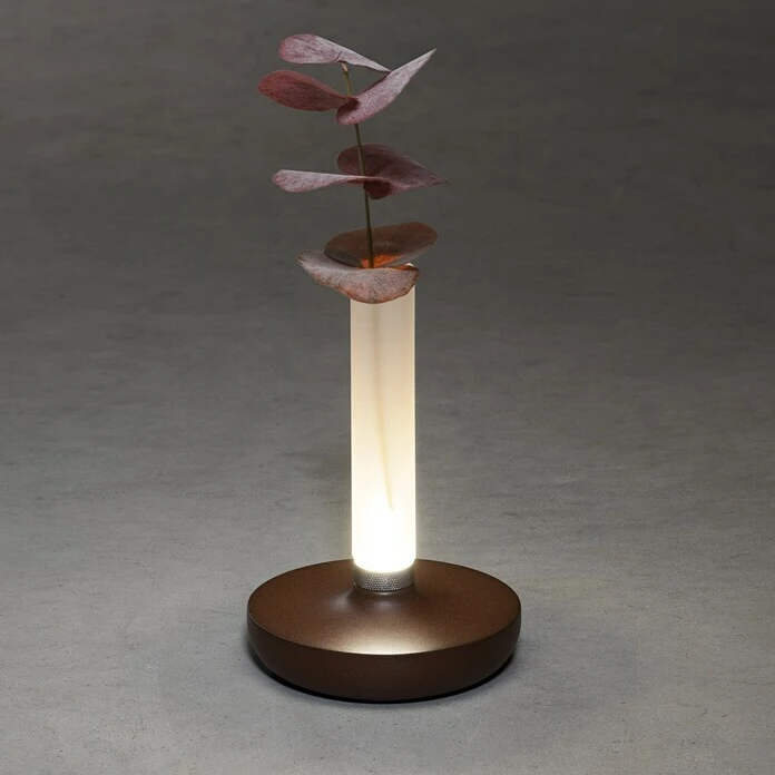Elegante premium Akku-Tischleuchtenvase, die für den Einsatz im Innen- und Außenbereich geeignet ist. Die gesamte Leuchte ist hochwertig verarbeitet. Die Phiole ist aus opalem Echtglas und der Fuß vollständig aus Aluminium gefertigt. Durch ihr proportional hohes Gewicht und ihre rutschfesten Füße, hat sie eine hohe Standfestigkeit. Die Leuchte wird über eine USB-Ladeplattform (im Lieferumfang enthalten) geladen und leuchtet bis zu 20 Stunden. Über den Metall Drehring am Fuß läßt sich die Beleuchtung an und aus schalten, sowie die Dimmung (10-50 lm stufenlos) einstellen. Die Einstellung der Farbtemperatur (1800/3000/4000K) erfolgt über einen Druckknopf unter dem Fuß. Schaffen sie mit der Premium-USB-Akku-Leuchte von Konstsmide ein ganz besonderes Ambiente, ob zu Hause, im Garten oder in der Gastronomie.