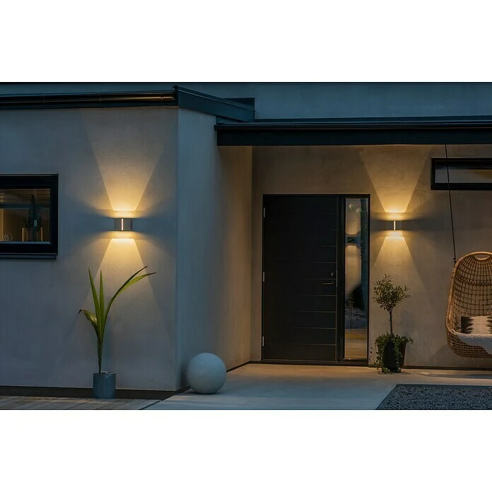 Die Pavia Wandleuchte 2×2 LED von Konstsmide ist vielseitig an Fassaden und Hauseingängen im Außenbereich einsetzbar. Sie zeichnet sich durch die Hohe Wandstärke ihres Voll-Aluminium-Gehäuses, sowie ihre robuste und witterungsbeständige Bauweise aus. Das moderne Design der Leuchte schlägt sich in ihren klaren Linien nieder. Durch einen Spalt an der Vorderseite des Gehäuses wird ein Lichtbild erzeugt. Die hohe Qualität der verbauten LED-Komponenten stellen die Langlebigkeit und Leistungsstärke sicher.
