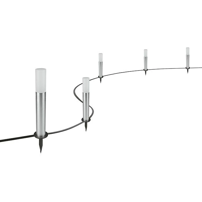 Das Endura Style LED-Gartenspot-Set Pole eignet sich sehr gut für eine dekorative Wegebeleuchtung im Außenbereich, da die Spots mit Schutzart IP65 gegen Strahlwasser geschützt sind und das Set ein IP44 Netzteil enthält. Mit den Erdspießen lassen sich die Spots bequem im Erdboden befestigen und können bei Bedarf einfach an einem anderen Ort befestigt werden. Entlang von Wegen sorgen die 5 miteinander verbundenen Spots für eine Orientierungsbeleuchtung. Allerdings eignen sich die Spots dank ihrer warmweißen Lichtfarbe auch sehr gut als Beleuchtung an anderen Stellen im Garten. Die Netzleitung hat eine Länge von 5 Metern vom Stecker bis zum ersten Spot. Die Spots untereinander haben einen Kabelabstand von 50 Zentimetern, sodass sie in einem ausreichenden Abstand zueinander platziert werden können. Bei einer Leistung von jeweils 1,5 Watt hat das energiesparende LED-Leuchtmittel eine Strahlkraft von jeweils 57 Lumen und überzeugt mit einer langen Lebensdauer.