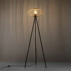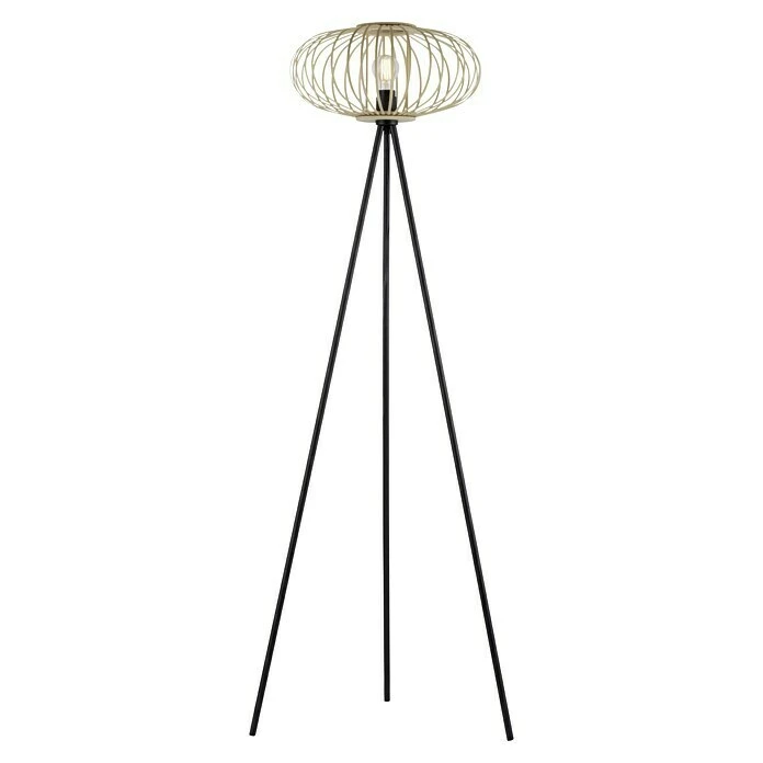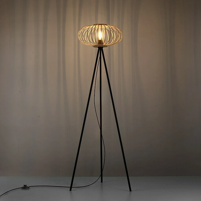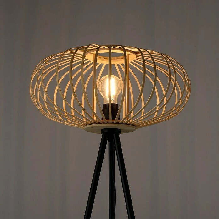 Ein zartes, dreibeiniges Gestell aus schwarz lackiertem Metall bildet den Fuß der Stehleuchte RACOON. Auf diesem sitzt ein ellipsenförmiger Schirm aus einzelnen Sperrholz-Elementen. Die Kombination der Farben und Materialien wirkt zugleich modern und natürlich und passt dadurch besonders gut zum skandinavischen Wohntrend. Das Leuchtmittel ist nicht inklusive und kann daher frei gewählt werden. Da der Blick auf das Leuchtmittel frei ist, bietet sich hier ein Filament-Leuchtmittel an, welches das Design der Stehlampe abrundet. Im eingeschalteten Zustand entsteht eine dekorative Schattenbildung in der Umgebung der Standleuchte. Das Ein- und Ausschalten erfolgt bequem über integrierten Fußschalter.