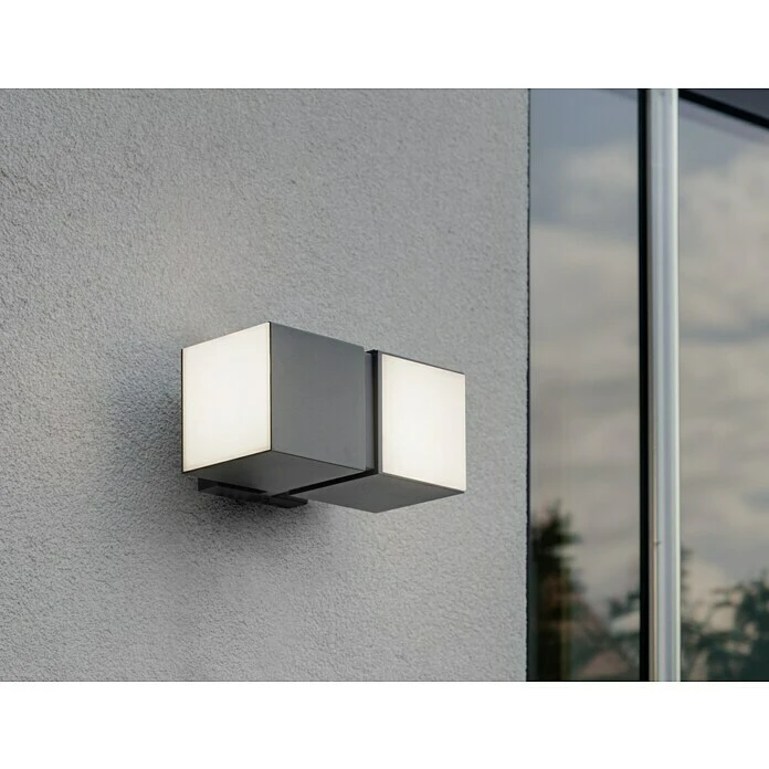 Die Lutec LED-Außenwandleuchte Cuba aus Aluminium-Druckguss ist mit Schutzart IP54 für eine Anbringung an Fassaden im Außenbereich geeignet. Mit ihrer Optik aus anthrazit und weißem Diffusor aus Polycarbonat passt sie sich sehr gut an und verleiht der Wand eine edle Beleuchtung. Durch die 350° drehbaren Köpfe ist eine Anpassung der Strahlung an die jeweiligen Bedürfnisse variabel möglich. Das fest verbaute LED-Leuchtmittel strahlt eine angenehm warmweiße Lichtfarbe aus, die sich durch den Diffusor gleichmäßig blendfrei verteilt.