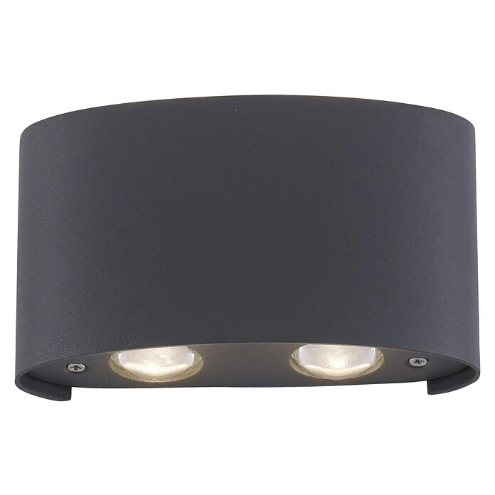 Die anthrazitfarbene LED-Wandleuchte CARLO überzeugt mit ihrer modernen und schlichten Optik. Die Leuchte wird mit vier festverbauten 0,80 Watt LED-Leuchtmitteln geliefert. Jedes Leuchtmittel strahlt bei einer Lichtfarbe von 3000 Kelvin und rund 120 Lumen aus. Ihr Lichteinfall strahlt nach oben und unten ab, dies wirkt zugleich dekorativ und spendet besonders viel Licht. Dank der verwendeten LED-Technik zeichnet sich die Leuchte als energiesparend aus und überzeugt dabei mit einer geringen Wärmeentwicklung sowie hohen Lebensdauer. Sie ist der ideale Leuchtspaß für draußen. Die Wandleuchte wartet mit bis zu ca. 25000 Lichtstunden auf – viele intensive Leuchtmomente sind mit ihr also garantiert. Setzen Sie einen eindrucksvollen Akzent mit der modernen LED Wandleuchte! Durch ihre Schutzart IP54 ist die Leuchte spritzwasser- und staubgeschützt und kann somit perfekt an der Hauswand platziert werden.