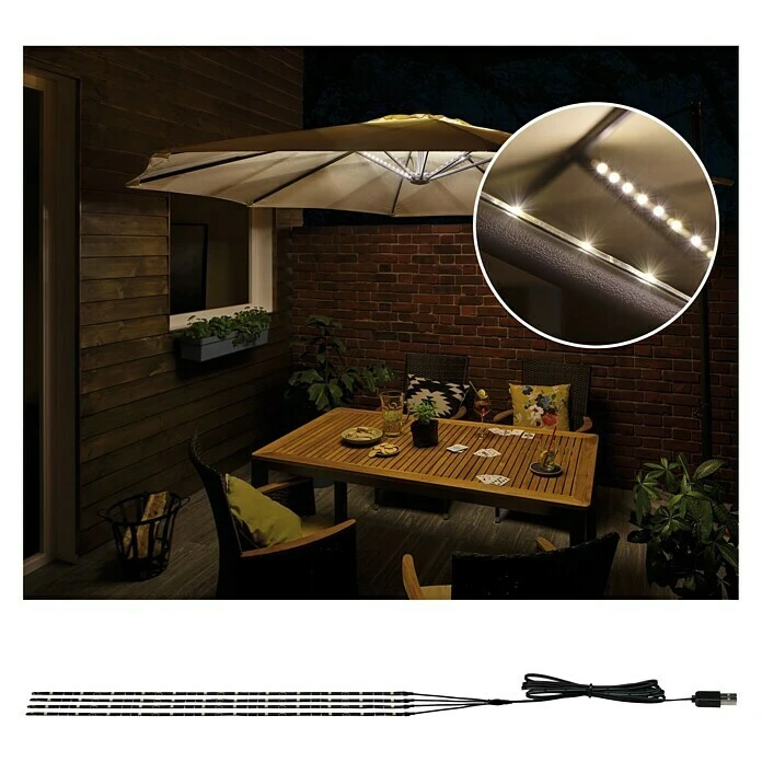 Das 4-flammige LED-Band Parasol von Paulmann verleiht Sonnenschirmen ein besonderes Erscheinungsbild. Durch die selbstklebende Rückseite ist die Montage an der Innenseite des Schirms sehr einfach. Dort sorgt es für angenehme Lichteffekte, die zu einer wohligen Atmosphäre im Freien beiträgt. Besonders an einem schönen Sommerabend lädt das warmweiße Licht unter dem Sonnenschirm zum Verweilen ein. Die Leuchtdauer beträgt acht Stunden und die Aufladung erfolgt durch den USB-Stecker. Des Weiteren ist auch die Nutzung mithilfe einer Powerbank denkbar. Die fest verbauten, energiesparenden LED-Leuchtmittel überzeugen mit einer langen Lebensdauer.