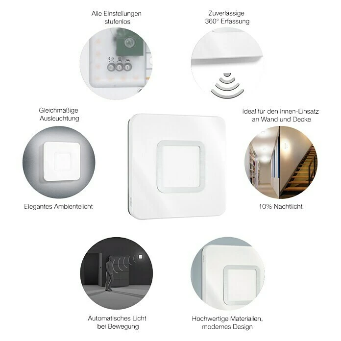 Geschmackvolles Design für innen. Ideal für den Innen-Einsatz an Wand und Decke: Die Kombination von Ambientelicht, guter Ausleuchtung und intelligenter Technologie. Die neuen LED-Innenleuchten mit integriertem Hochfrequenzsensor bieten eine Lichtleistung von 759 lm und sind mit neuster Lichttechnik ausgestattet. Mit einem Verbrauch von nur 8,8 W werden die geringen Stromkosten für leuchtende Augen beim Hausherrn sorgen. Und das bei einer optimalen Ausleuchtung und edlem Ambientelicht. Mit komfortabler Nachtlichtfunktion (10 %) und 4 Stunden Dauerlicht.