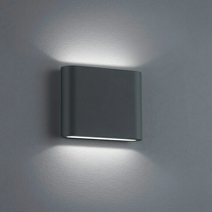 Die Wandleuchte THAMES II von Trio Leuchten zaubert tolle Lichtakzente an Ihre Hausfassade. Die moderne up and down Beleuchtung sorgt für eine effektvolle Lichtstimmung im Innen- und Außenbereich. Im Wohnraum kommt sie vor allem als zeitgemäße Beleuchtung von Fluren und Dielen oder als schöne Designakzent zur Geltung. Ganz gleich für welchen Zweck Sie Ihre Wandleuchte benötigen – ob Sie auf der Suche nach Wandleuchten zur Fassadenbeleuchtung im Eingangsbereich oder auf der Terrasse sind oder nach einer modernen Alternative für eine stimmungsvolle Beleuchtung im Wohnraum sind, all diesen Ansprüchen wird die 11,5 cm breite Wandleuchte mit IP54 Schutz in jeder Hinsicht gerecht. Das anthrazitfarbene Design sorgt für ein schlichtes und zeitloses Erscheinungsbild. Darüber hinaus verfügt die Leuchte über eine moderne LED Technologie, die sich durch eine hohe Lichtqualität und Energieeffizienz auszeichnet. Im Vergleich zu herkömmlichen Halogen Leuchtmitteln lassen sich bis zu 80% der Energiekosten sparen. Zusätzlich haben LED Lichtquellen eine lange Lebensdauer, produzieren weniger Wärme und schonen die Umwelt.