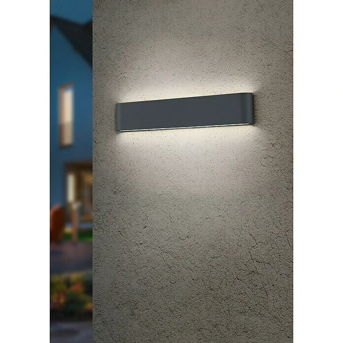 Die Wandleuchte THAMES II von Trio Leuchten zaubert tolle Lichtakzente an Ihre Hausfassade. Die moderne up and down Beleuchtung sorgt für eine effektvolle Lichtstimmung im Innen- und Außenbereich. Im Wohnraum kommt sie vor allem als zeitgemäße Beleuchtung von Fluren und Dielen oder als schöne Designakzent zur Geltung. Ganz gleich für welchen Zweck Sie Ihre Wandleuchte benötigen – ob Sie auf der Suche nach Wandleuchten zur Fassadenbeleuchtung im Eingangsbereich oder auf der Terrasse sind oder nach einer modernen Alternative für eine stimmungsvolle Beleuchtung im Wohnraum sind, all diesen Ansprüchen wird die 46,5 cm breite Wandleuchte mit IP54 Schutz in jeder Hinsicht gerecht. Das anthrazitfarbene Design sorgt für ein schlichtes und zeitloses Erscheinungsbild. Darüber hinaus verfügt die Leuchte über eine moderne LED Technologie, die sich durch eine hohe Lichtqualität und Energieeffizienz auszeichnet. Im Vergleich zu herkömmlichen Halogen Leuchtmitteln lassen sich bis zu 80% der Energiekosten sparen. Zusätzlich haben LED Lichtquellen eine lange Lebensdauer, produzieren weniger Wärme und schonen die Umwelt.
