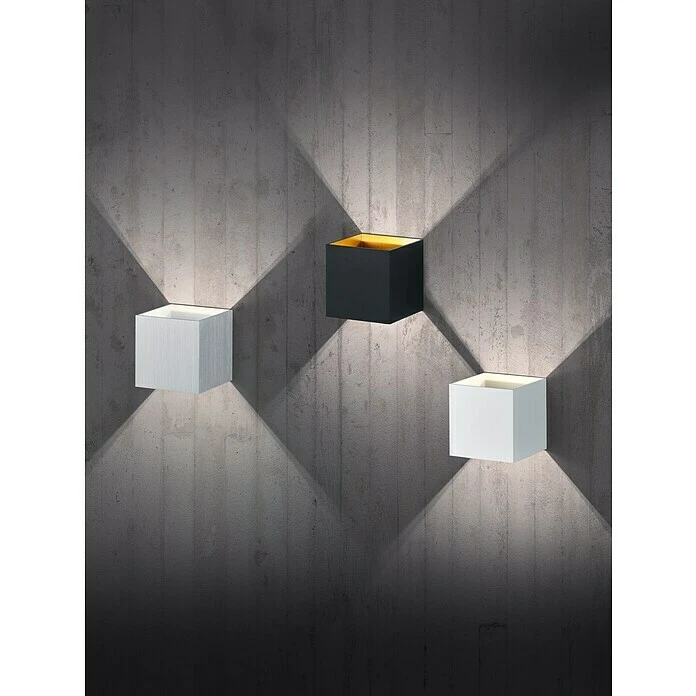 Schaffen Sie moderne Lichtakzente und ein stimmungsvolles Ambiente mit der kubusförmigen Wandleuchte LOUIS. Über einen oberen und einen unteren Lichtaustritt, wird ein effektvoller Lichtkegel gestaltet und ein harmonisches Gesamtbild kreiert. Integriert an der Wand in Ihrem Wohnraum oder dekorativ im Flurbereich oder Treppenaufgang in Szene gesetzt, wird der Anwendungsbereich angenehm erhellt. Der Kubus hat eine Größe von 10x10x10 cm. Die Leuchte aus Metall erscheint außen in schwarz-matt und ist innen goldfarbig gehalten. Darüber hinaus verfügt die Leuchte über eine moderne LED Technologie, die sich durch eine hohe Lichtqualität und Energieeffizienz auszeichnet. Im Vergleich zu herkömmlichen Halogen Leuchtmitteln lassen sich bis zu 80% der Energiekosten sparen. Zusätzlich haben LED Lichtquellen eine lange Lebensdauer, produzieren weniger Wärme und schonen die Umwelt.