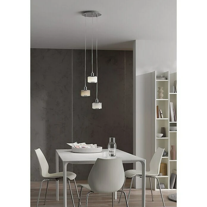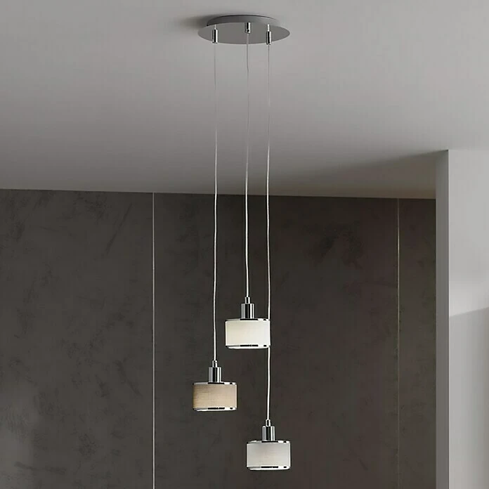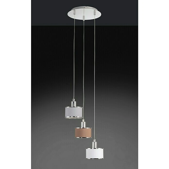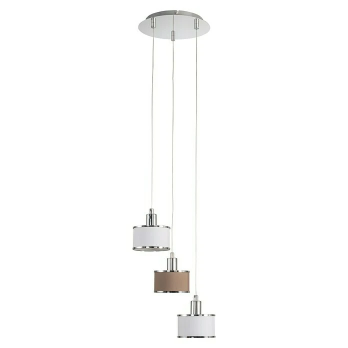 Pendelleuchte CIARA von Wofi! Diese Pendelleuchten sind im besonderen Maße beachtenswert: Die weißen und/oder braunen Schirme sind aus Stoff und die Oberfläche der Aufhängung ist in glänzendem Chrom gehalten. Die Pendelkörper erreichen eine max. Deckenabhängung von 150 cm und eignen sich so perfekt für den Wohn- und Esszimmerbereich.